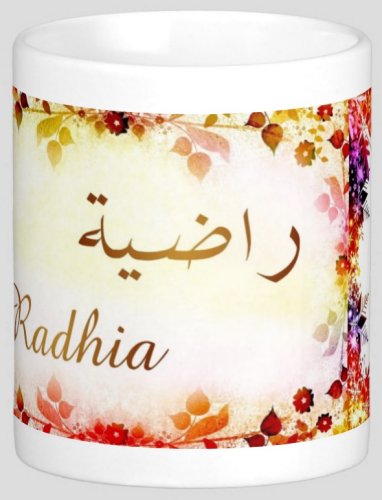 Mug avec le prénom "Radhia" écrit en français, en arabe (راضية) et calligraphié de façon artistique en arabe sur la partie droite.