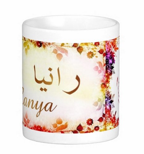Mug avec le prénom "Ranya" écrit en français, en arabe (رانيا) et calligraphié de façon artistique en arabe sur la partie droite.
