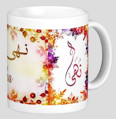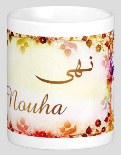 Mug avec le prénom "Nouha" écrit en français, en arabe (نهى) et calligraphié de façon artistique en arabe sur la partie droite.