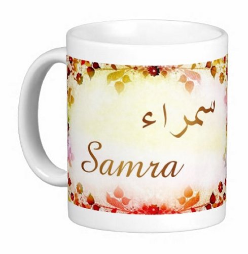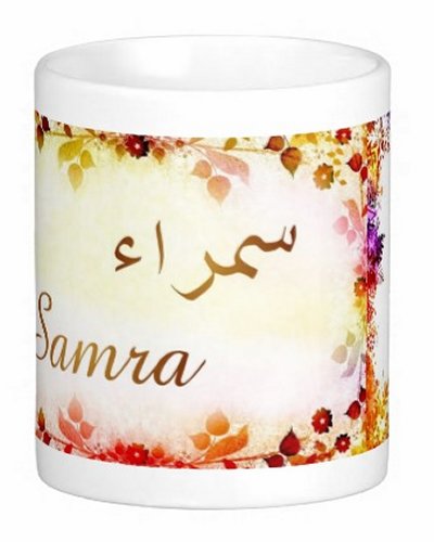Mug avec le prénom "Samra" écrit en français, en arabe (سمراء) et calligraphié de façon artistique en arabe sur la partie droite.
