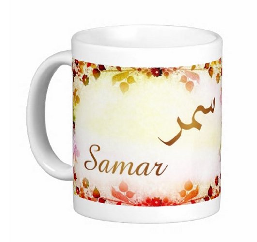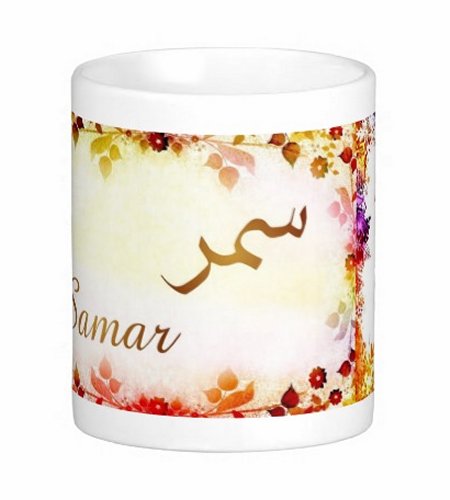 Mug avec le prénom "Samar" écrit en français, en arabe (سمر) et calligraphié de façon artistique en arabe sur la partie droite.