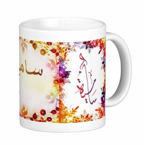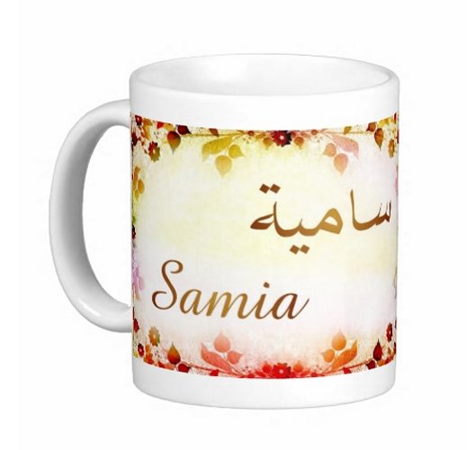 Mug avec le prénom "Samia" écrit en français, en arabe (سامية) et calligraphié de façon artistique en arabe sur la partie droite.