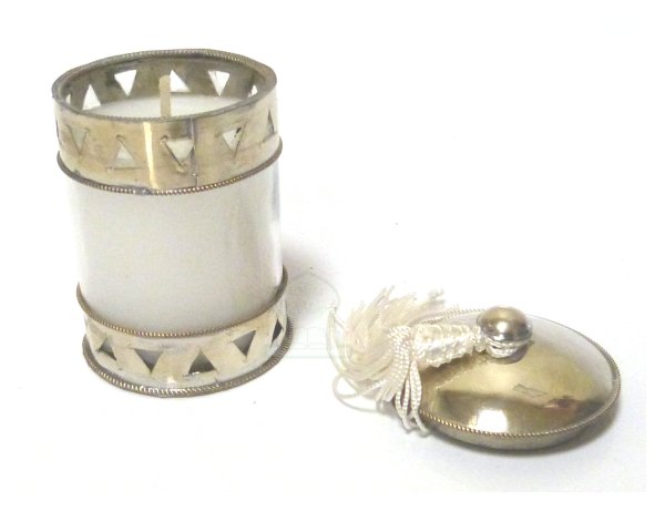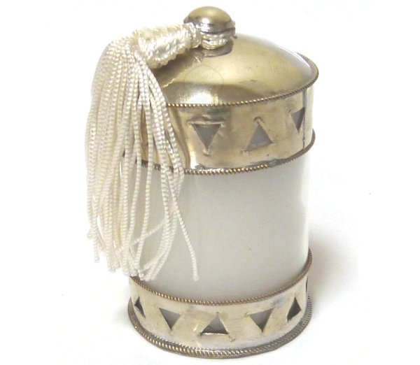 Boîte à bougie artisanale en verre, contenant une bougie couleur blanche ; le bougeoir est cerclé de métal argenté, joliment décoré de ciselures de forme triangulaire, se terminant par un pompon blanc en sabra marocain...