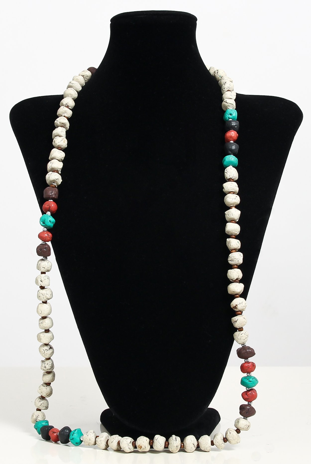 Long collier ethnique artisanal imitation pierres couleur blanche agremente de perles et autres pierres colorees