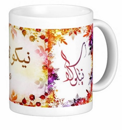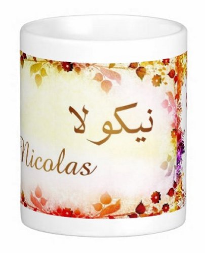 Mug avec le prénom "Nicolas" écrit en français, en arabe (نيكولا) et calligraphié de façon artistique en arabe sur la partie droite.