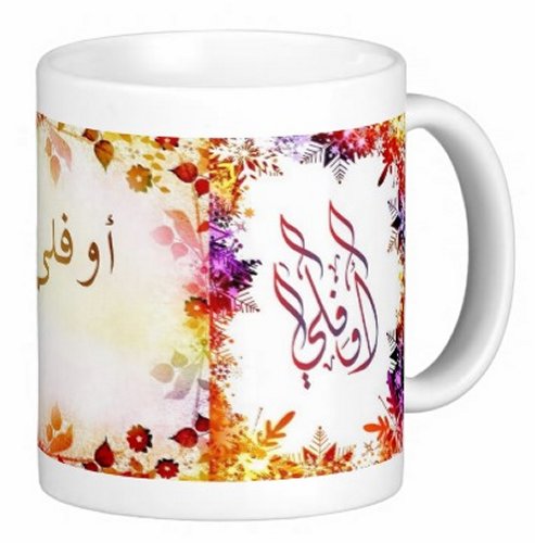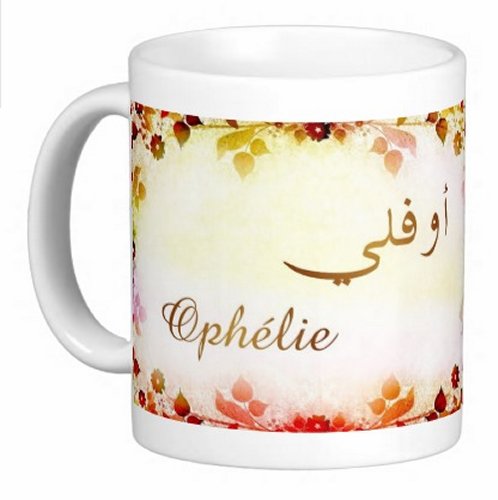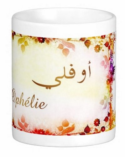 Mug avec le prénom "Ophélie" écrit en français, en arabe (أوفلي) et calligraphié de façon artistique en arabe sur la partie droite.