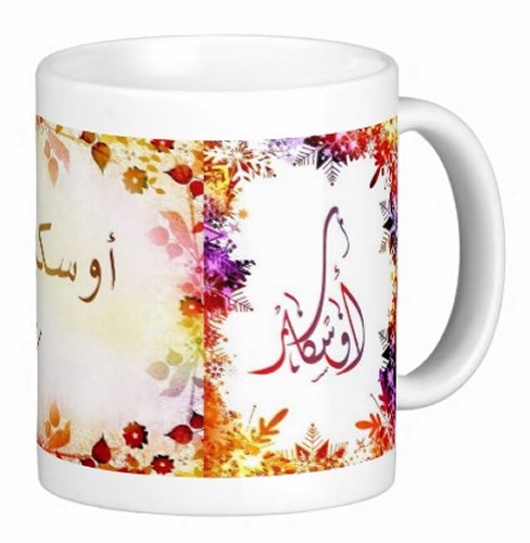 Mug avec le prénom "Oscar" écrit en français, en arabe (أوسكار) et calligraphié de façon artistique en arabe sur la partie droite.