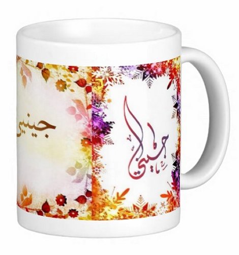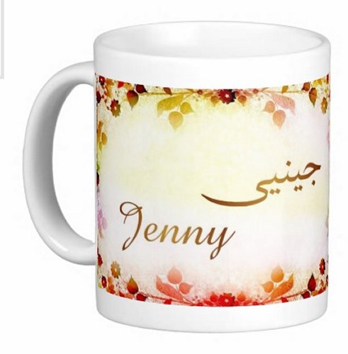 Mug avec le prénom "Jenny" écrit en français, en arabe (جيني) et calligraphié de façon artistique en arabe sur la partie droite.