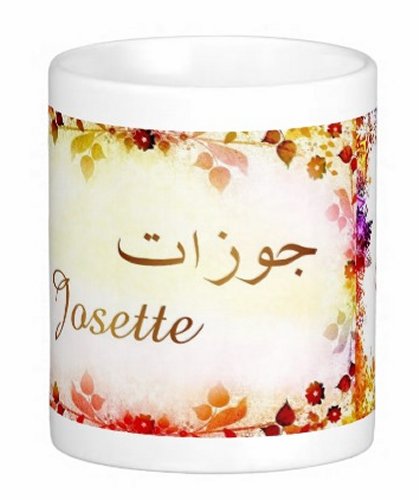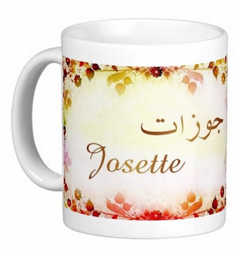 Mug avec le prénom "Josette" écrit en français, en arabe (جوزات) et calligraphié de façon artistique en arabe sur la partie droite.
