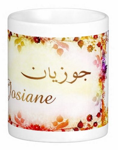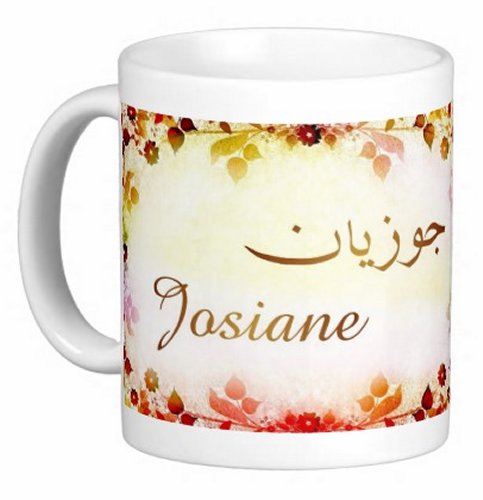 Mug avec le prénom "Josiane" écrit en français, en arabe (جوزيان) et calligraphié de façon artistique en arabe sur la partie droite.