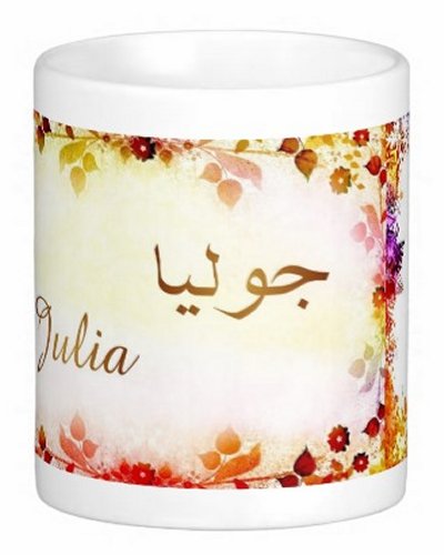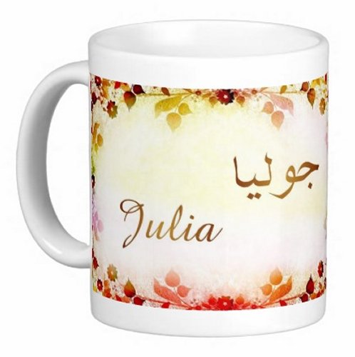 Mug avec le prénom "Julia" écrit en français, en arabe (جوليا) et calligraphié de façon artistique en arabe sur la partie droite.