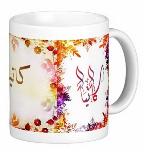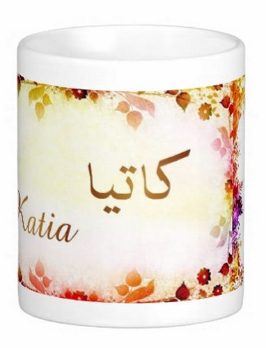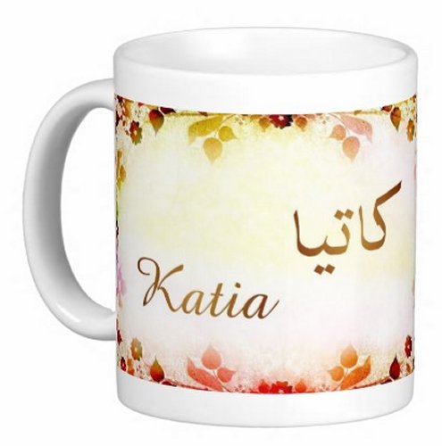 Mug avec le prénom "Katia" écrit en français, en arabe (كاتيا) et calligraphié de façon artistique en arabe sur la partie droite.