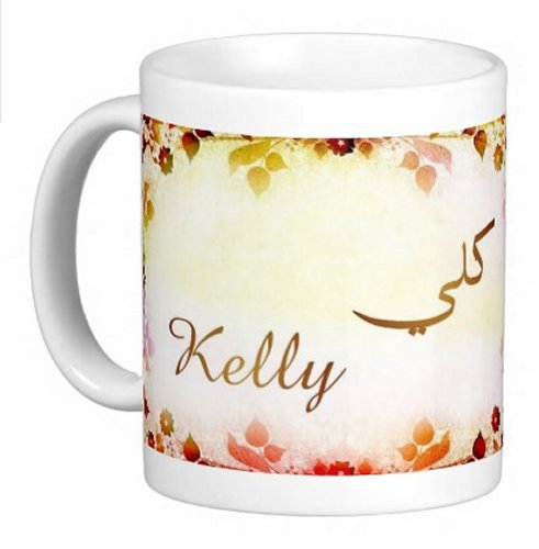 Mug avec le prénom "Kelly" écrit en français, en arabe (كلي) et calligraphié de façon artistique en arabe sur la partie droite.