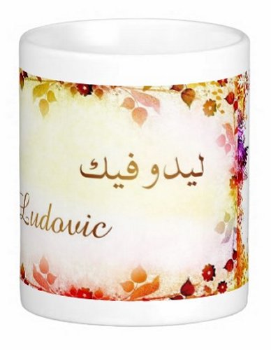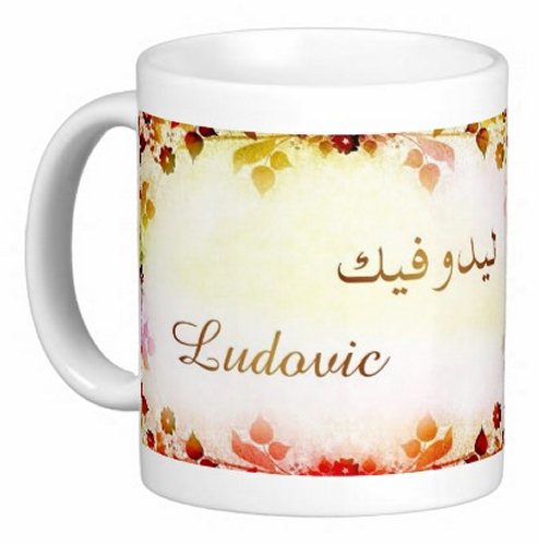 Mug avec le prénom "Ludovic" écrit en français, en arabe (ليدوفيك) et calligraphié de façon artistique en arabe sur la partie droite.