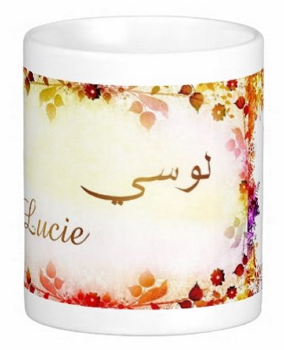 Mug avec le prénom "Lucie" écrit en français, en arabe (لوسي) et calligraphié de façon artistique en arabe sur la partie droite.