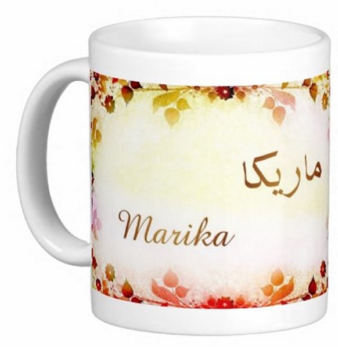 Mug avec le prénom "Marika" écrit en français, en arabe (ماريكا) et calligraphié de façon artistique en arabe sur la partie droite.