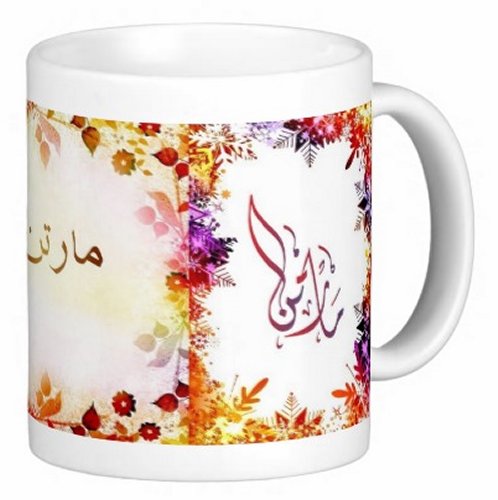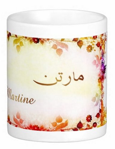 Mug avec le prénom "Martine" écrit en français, en arabe (مارتن) et calligraphié de façon artistique en arabe sur la partie droite.