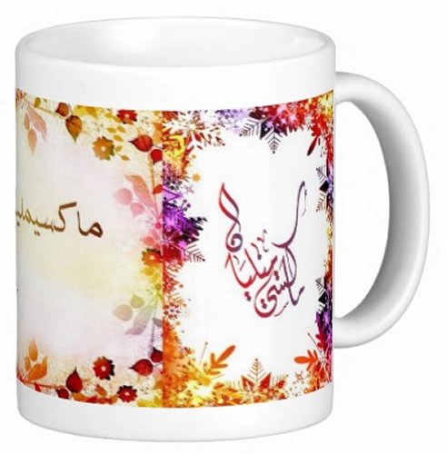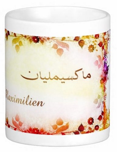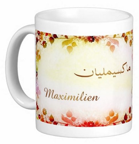 Mug avec le prénom "Maximilien" écrit en français, en arabe (ماكسيمليان) et calligraphié de façon artistique en arabe sur la partie droite.