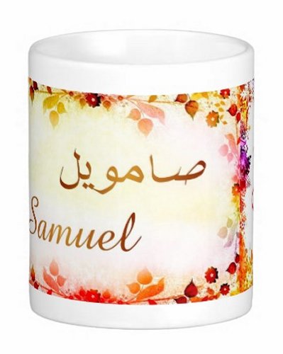 Mug avec le prénom "Samuel" écrit en français, en arabe (صامويل) et calligraphié de façon artistique en arabe sur la partie droite.