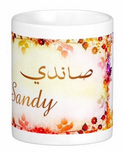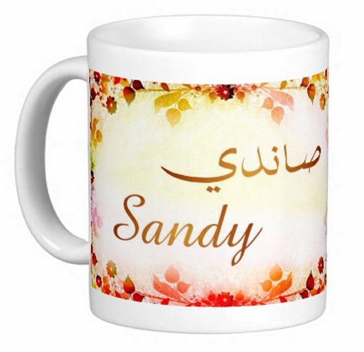 Mug avec le prénom "Sandy" écrit en français, en arabe (صاندي) et calligraphié de façon artistique en arabe sur la partie droite.