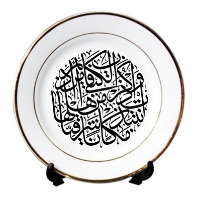Assiette en porcelaine avec calligraphie artistique de Sourate Meriem (Marie) verset 16. Calligraphie réalisées par un calligraphe professionnel.