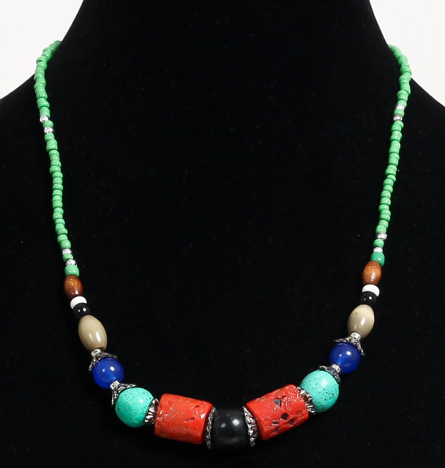 Collier ethnique artisanal imitation pierres cylindrées multicolores agencées de perles vertes et noires - REF. 19083 (22.00 €)