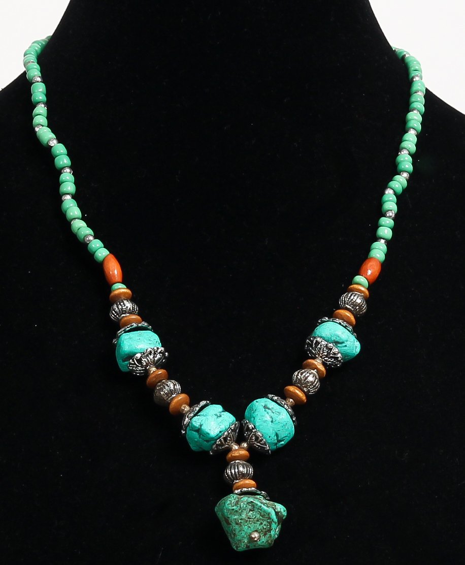Collier ethnique artisanal imitation pierres difformes turquoises séparées de perles en métal avec une boule en métal et des perles vertes - REF. 18947 (14.00 €)