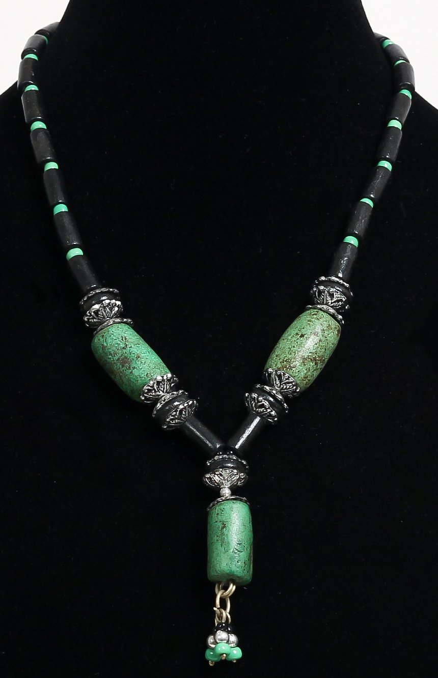 Collier ethnique artisanal imitation trois cylindres verts agrémentés de perles vertes et de tubes noirs Vetement & Accessoire