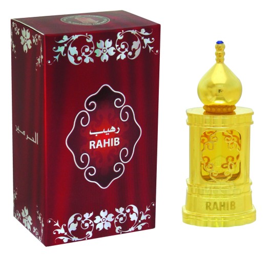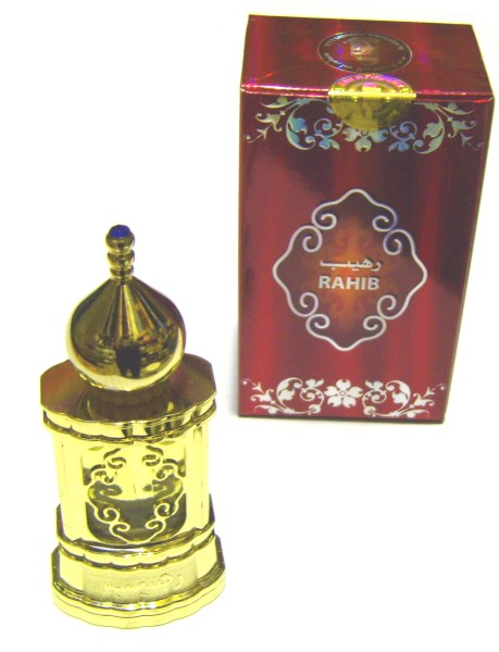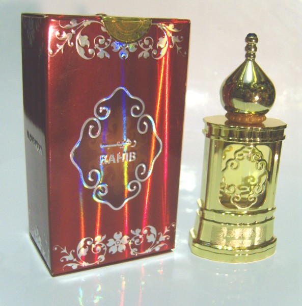 Parfum concentré sans alcool "Rahib". Bouteille en verre décorée de métal doré.