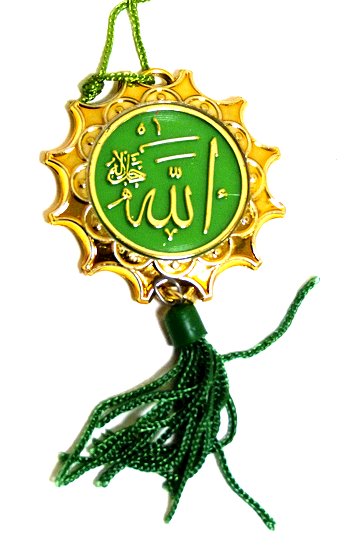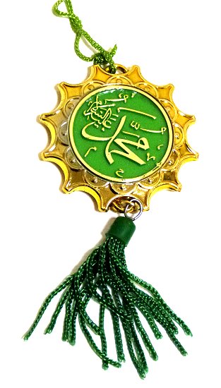 Pendentif vert doré avec les calligraphies dorées "Allah" sur une face et "Muhammad (SAW)" sur l'autre face. Peut être accroché dans la voiture ou autre lieux.