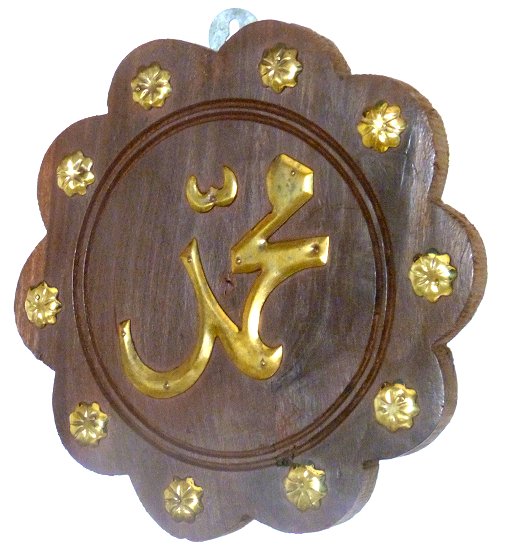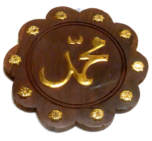 Objet décoratif artisanal en bois avec inscription en métal doré du nom du Prophète "Muhammad" (SAW) calligraphié en arabe.