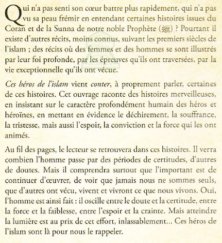 Ce "héros de l’islam" vient conter, à proprement parler, certaines histoires issues du Coran et de la Sunna de notre noble Prophète (sws). Il existe cependant d’autres récits des premiers siècles de l'Islam, moins connus,ou des femmes et des hommes se sont illustrés par leur foi profonde, par les épreuves qu’ils ont traversé et par la vie exceptionnelle qu’ils ont vécue.
