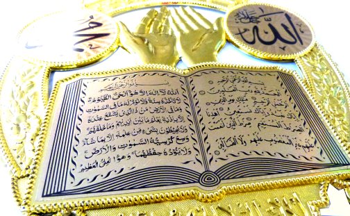 Décoration dorée avec le Nom d'ALLAH, La Basmala et le verset du Trône (Ayat Al-Koursi) - REF. 24045 (3.90 €)