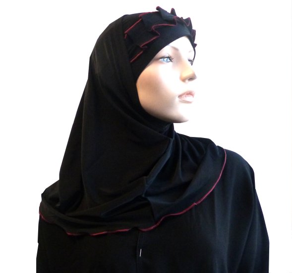 Très beau hijab 2 pièces noirs avec ruban froncé piqué bordeaux.