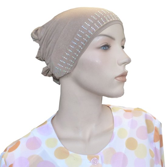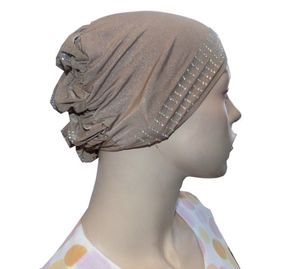 Bonnet taupe pailleté avec strass sur le devant ainsi que sur la coiffe.