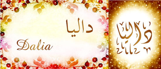 Mug avec le prénom "Dalia" écrit en français, en arabe (داليا) et calligraphié de façon artistique en arabe sur la partie droite.
