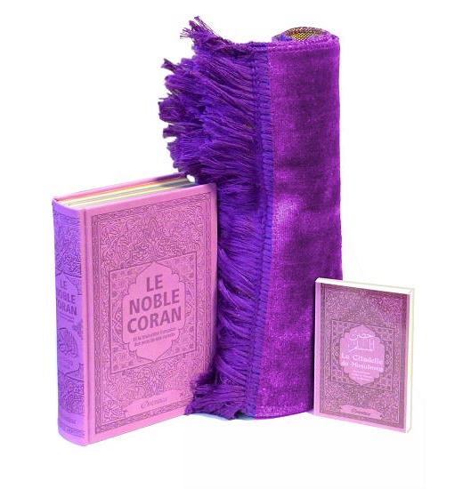 Pack cadeau : Le Noble Coran (bilingue français/arabe) mauve + La Citadelle Du Musulman mauve assortie + tapis de priere en velours - REF. 23256 (40.00 €)