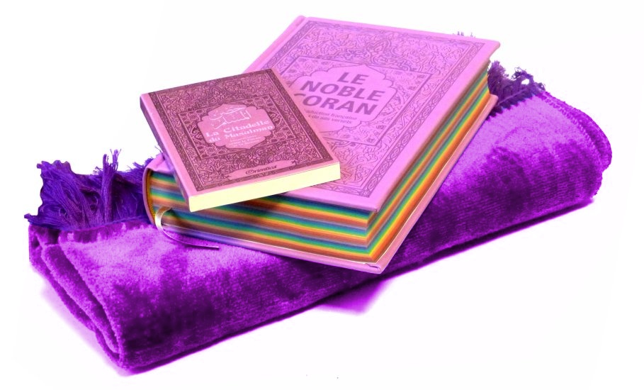 Pack Cadeau Mauve : Le Noble Coran avec couleurs Arc-en-ciel (Rainbow), La Citadelle du Musulman, Le Prophète Muhammad (SAW) et la femme, Tapis uni en velours, Diffuseur de parfum (assortis) - REF. 24134 (39.90 €) - En Promotion à 35.00 €