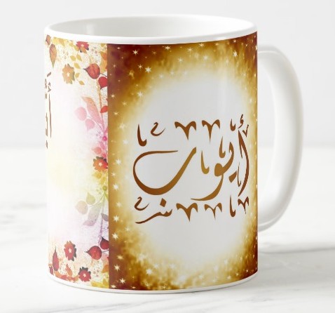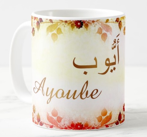 Mug avec le prénom "Ayoube" écrit en français, en arabe (أيوب) et calligraphié de façon artistique en arabe sur la partie droite.