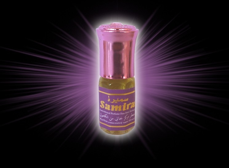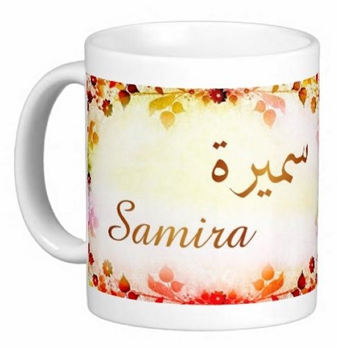 Pack constitué du Parfum (3 ml) "Samira" et du Mug avec le prénom "Samira" écrit en français, en arabe (سميرة) et calligraphié de façon artistique en arabe sur la partie droite.