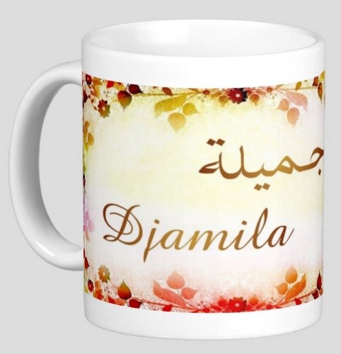 Pack constitué du Parfum (3 ml) "Djamila" et du Mug avec le prénom "Djamila" écrit en français, en arabe (جميلة) et calligraphié de façon artistique en arabe sur la partie droite.
