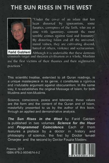The Sun Rises in the West by Farid Gabteni is published in two volumes: Science for the Hour and Programmed Coincidence. Each of them features a preface by a doctor in history and philosophy of science, the first by Doctor Ismaël Omarjee and the second by Doctor Fouzia Madani.