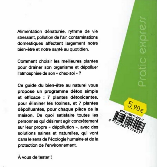 Alimentation dénaturée, rythme de vie stressant, pollution de l'air, contaminations domestiques affectent largement notre bien-être et notre santé au quotidien. Comment choisir les meilleures plantes pour drainer son organisme et dépolluer l'atmosphère de son "chez-soi" ? Ce guide du bien-être au naturel vous propose un programme détox simple et efficace : 7 plantes détoxifiantes, pour éliminer les toxines, et 7 plantes dé-polluantes, pour chaque pièce de la maison.