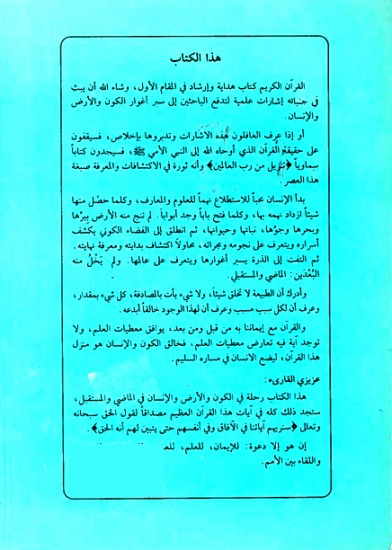 الكتاب يتناول الإعجاز العلمي في القرآن الكريم ويكشف عن الارتباط بين الآيات الكونية والآيات التنزيلية القرآنية فهو رحلة في الكون والأرض والإنسان ودعوة للإيمان والعلم والعمل والحضارة والتقارب واللقاء بين الأمم.