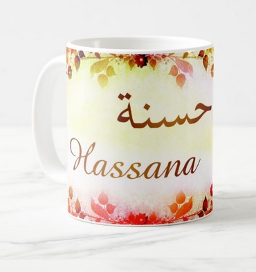 Mug avec le prénom "Hassana" écrit en français, en arabe (حسنة) et calligraphié de façon artistique en arabe sur la partie droite.