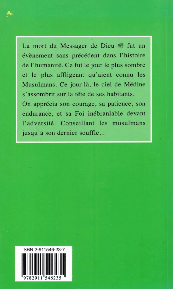 La mort du messager de Dieu (salut et bénédiction sur lui) fut un événement sans précédent dans l'histoire de l'humanité. Ce fut le jour le plus sombre et le plus affligeant qu'aient connu les Musulmans. Ce jour là, le ciel de Médine s'assombrit sur les têtes de ses habitants. Il appliquait à la lettre et dans ses moindres petits détails les préceptes du Saint Coran, autant dans sa vie privée que sociale. Dieu (loué soit-ll), n'avait-ll pas dit : Nous t'avons envoyé pour parfaire la bonne conduite. C'était l'homme parfait. On appréciera son courage, sa patience, sa longanimité, son endurance et sa foi inébranlable devant l'adversité comme devant sa mort. Exhortant, avertissant et conseillant les Musulmans, jusqu'a son dernier souffle. O mon Dieu ! Faites en sorte, qu'il reçoive la place la plus élevée du plus haut de Tes Paradis. Le Traducteur.