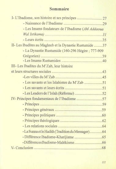Accueillis par les Bani Masâb ou Mozabites, ils fondèrent le M’zab actuel. Dans la deuxième partie du livre, l’auteur fait ressortir les grands principes de cette école musulmane et ses particularités sur les hadiths et certaines interprétations du Coran. Il met également en exergue les principales différences avec les autres écoles sunnites.