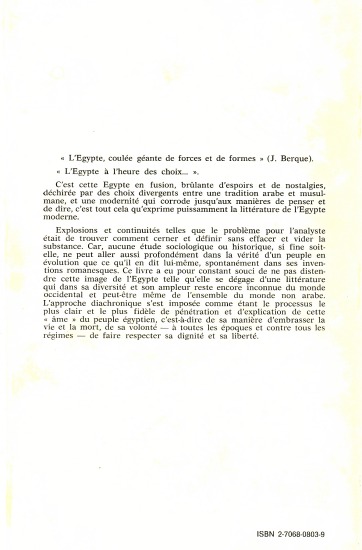 Etude très approfondie, en 1981, du roman égyptien, par un professeur de Paris III. Préface de Jacques Berque. Bibliographie
