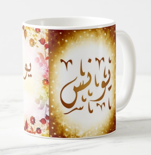Mug avec le prénom Younes calligraphié en arabe ainsi que son écriture normale en arabe (يونس) et en français.