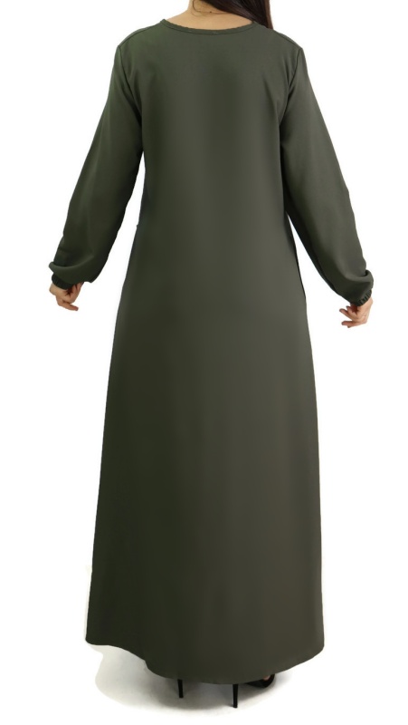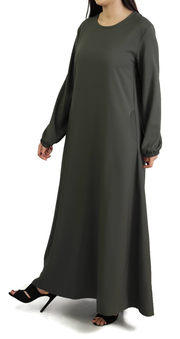 Robe évasée, avec deux poches latérales, tissu fluide et léger, légèrement élastique.